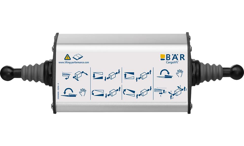 L'unité de commande Bär Control EVO: utilisable de manière intuitive, de construction robuste et parfaitement utilisable même avec des gants grâce aux interrupteurs à levier en croix. Dans le cas des Cargolifts RetFalt R2T, R4T, R4C et R4K, la SwitchKey pour la mise en marche et l'arrêt par mouvement du levier de commande gauche est de série.